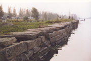 古纖道路基,是用石條砌成的一個(gè)個(gè)石墩,高出水面0.5米左右。墩與墩之間,用三塊長(zhǎng)約3米、寬約0.5米的石板平鋪而成。