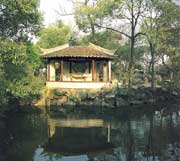 入門經(jīng)石砌小徑直對(duì)鵝池,立“鵝池”碑;過鵝池就是流觴亭,亭的周圍有木雕長窗,外有走廊環(huán)繞,翹角飛檐,古色古香。