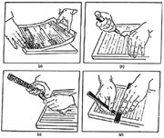 雕版印刷的工作流程分為以下三步: 首先,是雕刻印刷版。一般是請(qǐng)書法很好的人寫版,即將要雕刻的內(nèi)容先寫在一張紙上,然后將寫好的紙稿反貼于預(yù)先準(zhǔn)備好的木板表面,給予一定的壓力,使文字或圖像呈反向轉(zhuǎn)移到木板上,再由雕刻工人雕刻成反向凸起的文字或圖像。校正無(wú)誤后就準(zhǔn)備進(jìn)入下一道工序。