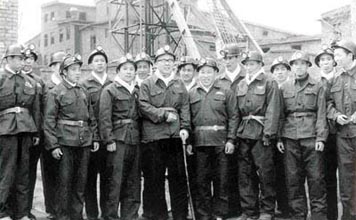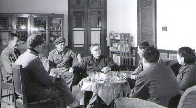 華羅庚和大慶工人一起討論應(yīng)用優(yōu)選法解決生產(chǎn)中的問題。 |