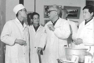 華羅庚同湖北制藥廠的工人一起進行優(yōu)選法的應(yīng)用實驗。 |