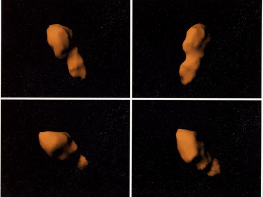 | 小行星Toutatis,圖片顯示其上有淺火山,山脊和頸狀谷 |