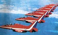 英國也是一個 航空大國,有著優(yōu)久的航空表演歷史。早在本世紀(jì)20年代,英國倫敦的亨登機場就成為航空表演的最早發(fā)源地之一,以克勞德.格雷厄姆.懷特為首的飛行家們,經(jīng)常在此舉行一些飛行表演活動。當(dāng)時飛行表演使用的飛機主要是“肯特列特”和“斗士”式雙翼機。1947年,英國皇家空軍將在奧吉哈姆的戰(zhàn)斗機聯(lián)隊的3架“吸血鬼”式飛機組建成英國第一支特技飛行表演隊。不久“流星”式戰(zhàn)斗機取代了“吸血鬼”飛機,1955年又改換為“獵人”式噴氣戰(zhàn)斗機。由于第54大隊特技飛行表演隊的所有飛行員都穿黑色飛行服,所以該飛行表演隊被稱為“黑色騎士”。1957年,第11大隊又組建了"流星"式戰(zhàn)斗機特技飛行表演隊。該隊飛機全部涂成黑色,在法國進行公開飛行表演后,被稱為“黑箭”飛行表演隊。這支飛行表演隊也是世界上第一支同時進行5機編隊表演的飛行表演隊。隨后,該隊的表演用機增加到9架,并于1957年在倫敦郊外的范堡羅航展上進行了9機編隊表演, 在當(dāng)時轟動了世界航空界。