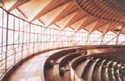 小體育宮優(yōu)美的球頂天花著稱(chēng)于世。它是一個(gè)建筑設(shè)計(jì)、結(jié)構(gòu)設(shè)計(jì)和施工技術(shù)巧妙結(jié)合的優(yōu)秀藝術(shù)品。球頂由1620塊用鋼絲網(wǎng)水泥預(yù)制的菱形槽板拼裝而成,板間布置鋼筋現(xiàn)澆成“肋”,上面再澆一層混凝土,形成整體兼作防水層。預(yù)制槽板的大小是根據(jù)建筑尺度、結(jié)構(gòu)要求和施工機(jī)具的起吊能力決定的。條條拱肋交錯(cuò)形成精美的圖案,如盛開(kāi)的秋菊,素雅高潔。球頂邊緣的支點(diǎn)很小,丫形斜撐上部又逐漸收細(xì),顏色淺淡,再加上對(duì)應(yīng)各支點(diǎn)間懸掛在球頂上的深色吊燈的對(duì)比作用,使球頂好像懸浮在空中。如此獨(dú)特的意境令人贊嘆,難怪奈爾維被稱(chēng)作“鋼筋混凝土詩(shī)人”。 小體育宮整個(gè)大廳的尺度處理也很好。穹頂中心的尺度最小,越往邊緣,尺度逐漸加大,與支架相接處的構(gòu)件尺度最大。最外邊的三個(gè)一組的構(gòu)件,順著拱肋走向,把力集中到支點(diǎn)上。而它們的輪廓與丫形斜撐上部形成的菱形,又與預(yù)制槽板的菱形相似,不過(guò)它們是通透的,不顯沉重。這種相似形狀的有韻律的重復(fù)和虛實(shí)對(duì)比手法,使整個(gè)穹頂分外輕盈和諧。