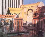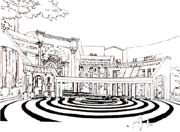 新奧爾良是美國南方城市。1973年,市政當(dāng)局決定在該市意商居民集中的地區(qū)建造意大利廣場。意大利廣場中心部分開敞,一側(cè)有祭臺,祭臺兩側(cè)有數(shù)條弧形的由柱子與檐部組成的單片“柱廊”,前后錯落,高低不等。這些“柱廊”上的柱子分別采用不同的羅馬柱式,祭臺帶有拱券,下部臺階呈不規(guī)則形,前面有一片淺水池,池中是石塊組成的意大利地圖模型,長約24米。新奧爾良市的意裔居民多源自西西里島,整個廣場就以地圖模型中的西西里島為中心。廣場鋪地材料組成一圈圈的同心圓,即以西西里島為中心。廣場有兩條通路與大街連接,一個進口處有拱門,另一處為涼亭,都與古代羅馬建筑相似。廣場場上的這些建筑形象明確無誤地表明它是意大利建筑文化的延續(xù)。