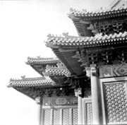中國(guó)古代房屋多有深遠(yuǎn)的出檐。《詩(shī)經(jīng)》就有“如暈斯飛”的句子贊美建筑物,可知西周大屋頂已引人注目,但不知有無(wú)翼角。出土的戰(zhàn)國(guó)銅屋、銅闕和銅器上鏤刻的建筑圖象都是直屋面和挑出很遠(yuǎn)的直屋檐,無(wú)翼角。現(xiàn)存最早的屋角做法表現(xiàn)在東漢石闕上,檐口是直的,在45°線(xiàn)上有斜置的角梁。角椽的排列有兩種方式:一種是角椽同正身椽平行,愈至角則椽愈短,椽尾插入梁側(cè);一種是角椽逐根加大斜度,向角梁傾斜,如鳥(niǎo)翼上的羽毛,椽尾也插入角梁側(cè),椽長(zhǎng)雖也逐根縮短,由于傾斜,所以長(zhǎng)度大于前一種。這兩種做法沿用到唐代,翼角的具體形象最早見(jiàn)于南北朝石刻中。最早的實(shí)物是五臺(tái)縣南禪寺大殿的翼角,它的角椽排列方法屬于第二種。