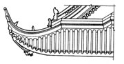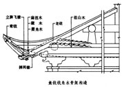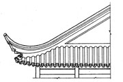 屋角處的角梁斷面高度為椽高的三倍左右,椽和角梁的下端都搭在檐檁上。為使角椽上皮逐漸抬高到與角梁上皮相平,以便鋪望板,在屋角處正側(cè)兩面的檁上各墊一根三角形木條,宋代稱(chēng)“生頭木”(清代稱(chēng)“枕頭木”)。這樣屋檐至角處就出現(xiàn)平緩的上翹(清代稱(chēng)為“起翹”)。這做法約始于南北朝后期。中國(guó)古代建筑翼角上翹的特點(diǎn),至此形成。