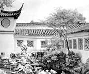 中國(guó)園林的園墻常設(shè)洞門(mén)。洞門(mén)僅有門(mén)框而沒(méi)有門(mén)扇,常見(jiàn)的是圓洞門(mén),又稱(chēng)月亮門(mén)、月洞門(mén);還可作成六角、八角、長(zhǎng)方、葫蘆、蕉葉等不同形狀。其作用不僅引導(dǎo)游覽、溝通空間,本身又成為園林中的裝飾。通過(guò)洞門(mén)透視景物,可以形成焦點(diǎn)突出的框景。采取不同角度交錯(cuò)布置園墻、洞門(mén),在強(qiáng)烈的陽(yáng)光下會(huì)出現(xiàn)多樣的光影變化。