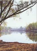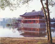 湖泊區(qū)是山莊風(fēng)景的重點。位于宮殿區(qū)之北,為大小洲嶼分隔成形式各異、意趣不同的湖面,用長堤、小橋、曲徑縱橫相連。湖岸曲逶,樓閣相間,層次豐富,一派江南水鄉(xiāng)景色。建筑采用分散布局手法,園中有園,每組建筑都形成獨立的小天地。山莊72景,有31景在湖區(qū)。在較大的島嶼或地段,布置了嚴(yán)謹(jǐn)四合院式的封閉空間,如“月色江聲”、“如意洲”。這里是皇帝宴飲和會客的地方,需要一定的格局和安靜的環(huán)境,建筑布局強調(diào)內(nèi)部空間的完整。在較小的島嶼或地段,則結(jié)合地勢布置樓閣,如“金山”、“煙雨樓”等。這里是眺望風(fēng)景的地方,視野廣闊,又是湖區(qū)觀賞視線的焦點,建筑布局著重外部造型的變化。湖泊區(qū)的許多景點是模仿江南名勝修建的。因此,建筑外形的豐富多變,回廊粉墻的廣泛使用,裝修的簡樸適度,以及山石的處理,色彩的搭配,都具有江南園林的特征;但建筑本身又是北方形式,疊石也以北方的青石為主,這些都與渾厚的自然景色和諧統(tǒng)一,形成獨特的園林風(fēng)格。