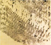 1944年,成都市東門(mén)外望江樓附近的唐墓出土一份印刷品《陀羅尼經(jīng)》,約一尺見(jiàn)方,上刻古梵文經(jīng)咒,四周和中央印有小佛像,邊上有一行漢字依稀可辨,為“成都府成都縣龍池坊卞家印賣(mài)咒本”。此經(jīng)咒所題“成都府”卞家印賣(mài)的時(shí)間當(dāng)在757年之后。可以說(shuō)明四川成都早在八世紀(jì)中葉,雕版印刷已經(jīng)流行。這份印刷品現(xiàn)存四川博物館。是國(guó)內(nèi)現(xiàn)存比較重要的一份唐代印刷品實(shí)物。 |