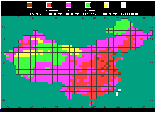 1°網(wǎng)格排放圖。有趣地是,該圖與前面的SOx和NOx圖規(guī)律有所不同:農(nóng)村NH3的排放高于某些城市;西部農(nóng)牧區(qū)NH3的排放,并不比東南部低多少。