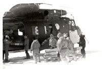 進(jìn)早餐時(shí),隊(duì)長通知我們八點(diǎn)半起飛,是今天的第三個(gè)“航班”。但因第一班飛機(jī)飛行時(shí)蓄電池出了故障,我們的航班推遲到九點(diǎn)半。航班推遲,有點(diǎn)出師不利之兆,我心里這樣想。九點(diǎn)半,直升飛機(jī)起飛。飛機(jī)上的高度表指示,飛機(jī)在海拔650-700米高度飛行。當(dāng)飛過南極大陸邊緣時(shí),但見陡峭的冰壁直上直下,與水面幾呈九十度角,若要靠自己攀登,真是不可想象。飛過陡峭的大陸冰緣后,看見了考察隊(duì)的大雪車在往南開行。飛行20分鐘后,直升機(jī)在一片白茫茫的雪原上著陸了。陽光經(jīng)白雪反射,十分刺眼。我試著摘下墨鏡觀看,根本受不了。10多個(gè)隊(duì)員正忙著卸貨。地面為偏東風(fēng),約5米/秒。我環(huán)望四周,但見往內(nèi)陸方向約20公里處,似乎有裸露的小山,點(diǎn)綴在雪白的原野上。