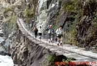 從排龍到玉梅,約40余華里,隊(duì)伍沿著帕隆藏布兩岸前進(jìn)。快到玉梅時(shí),一處新的大滑坡攔阻在前面。山坡上幾無人行的足跡。一看便知是10 月下旬那場暴雨帶來的新滑坡。丹增和加措在前面用冰鎬開道,刨開一條可以踏足的“小道”。路很險(xiǎn),這是對科考隊(duì)員而言,但對于兩位登山家又另當(dāng)別論了。加措選擇一條最短的路線,從山腰直切過去。他們倆很容易地就過了。我來到此處時(shí),除兩位登山家,達(dá)瓦副縣長和兩三位民工已經(jīng)過去了。我看了一下地形,覺得還可以改進(jìn)一下路線,我叫來丹增,建議把路修在山坡的肩處,這樣雖然繞一點(diǎn),但安全。因?yàn)樵谏窖幷巧酵钩鋈サ牡胤剑拖褚粋(gè)大腹翩翩的胖子的腹部一樣,若失足,必跌入波濤滾滾的江中無疑。丹增和加措笑笑:“對科學(xué)家們,原來修的路是難了。”他們兩人對接,很快把路伸到山坡的肩部。等候著的隊(duì)員和民工們沿著新的路安全過去了。