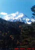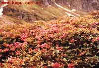 沿山而下,不知不覺中慢慢地景象就變了,四周不再是皚皚白雪,而是漫山遍野的綠。這里是高山灌叢草甸帶,在六月初到達(dá)這個(gè)高度,你會(huì)看到各色杜鵑競相開放,開花時(shí)是那樣的熱情奔放,小葉紫花杜鵑,血紅的平臥杜鵑……它們匍匐在地;伴著它們的有墊狀方枝柏,高山柳,加上黃花的錦雞兒等,組成一叢叢墊狀的花叢或一個(gè)個(gè)圓圈狀的花環(huán);更有那金黃色的塔狀大黃,竟都是亭亭玉立在這綠草鋪起的花的海洋里,大黃還是一種退熱解毒的中草藥用植物,我們渴時(shí)常折其嫩枝吸汁。 除了體念高山杜鵑之外,當(dāng)然還有草甸。這高山亞高山的草甸,是最適于牦牛放牧的夏季牧場。秋季,美麗的草甸依然殘存了幾分青春時(shí)的風(fēng)姿。龍膽花正當(dāng)時(shí)令,片片龍膽花如蘭色玉石雕琢而成;報(bào)春花當(dāng)然已經(jīng)蕊滅了,它們不聲不響地為明年春天的到來作準(zhǔn)備呢;而垂頭菊則更是低垂著腦袋,象是在沉思追憶剛逝去的燦爛陽光。