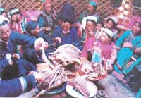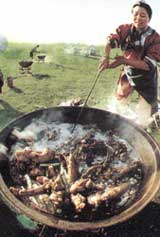 吃手抓羊肉最好的季節(jié)是秋天,此時(shí)草茂羊肥,蒙古族牧民每當(dāng)貴客來臨,在喝過奶茶之后,從羊群里挑選出膘肥肉嫩的羯羊,就地宰殺,扒皮入鍋,只需兩三碗奶茶的寒喧功夫,一大盤層層疊疊,熱氣騰騰的手抓羊肉就會(huì)擺在你的面前,在羊肉上還會(huì)插上幾把鋒利的藏刀。吃手抓羊肉,如果直接用嘴咬, 太不雅觀,多用刀割著吃,如何用刀,也很有講究。吃手抓羊肉,雖然吃得手滑嘴油,但仔細(xì)品味,爽而不膩,肥而不膻,油潤(rùn)肉酥,質(zhì)嫩滑軟,滋味不凡。吃手抓羊肉,沒有煎炒烹炸一套功夫,看起來似有原始之感,但多次品味,會(huì)越吃越饞,使人很久難忘。這一吃法,與蒙古族及藏族同胞歷史上長(zhǎng)期以來游牧生活有關(guān),因此法簡(jiǎn)單,加工制作比較容易,而且吃起來方便,一手抓肉,一手拿刀,割、挖、剔、片,可把羊骨頭上的肉吃得十分干凈。另外,手抓羊肉,其色、香、味、形也都代表著草原人民粗獷、豪放、熱情、虔誠(chéng)和好客的性格。到草原旅游,決不能不吃手抓肉。