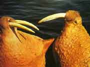 海象形似笨重,但卻十分靈巧。當(dāng)它潛入海底覓食時(shí),巨大的牙被運(yùn)用得得心應(yīng)手,不斷地翻掘泥沙,同時(shí),敏感的嘴唇和觸須也隨之探測、辨別,碰到食物,便用齒將其喜食的烏蛤、油螺等的殼咬破,然后將其肉體吃掉。