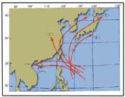 我國鄰近海區(qū)的臺風(fēng)移動路徑示意圖 |
