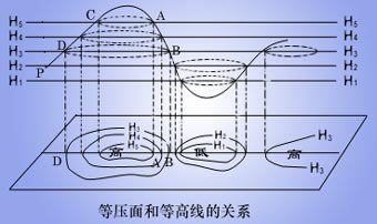 等高線和等壓面圖空間氣壓場的情況一般用等壓面圖表示。在空間的每一點(diǎn)都有一個(gè)氣壓值,如果把所有氣壓相同的點(diǎn)連接起來,就形成一個(gè)等壓面。由于同一高度上各地的氣壓不等,氣壓在空間的分布,就象山丘一樣起伏不平。在同一高度上,氣壓比四周高的地方,等壓面上凸,而且氣愈高的地方等壓面上凸的愈厲害;氣壓比周圍低的地方,等壓面上凹,而且氣壓愈低,等壓面下凹的愈厲害。因此,等壓面的起伏形勢和該面附近等高面上氣壓的分布形勢相對(duì)應(yīng)。