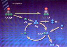 CCl2F+Cl。這個(gè)釋放出的氯原子,用數(shù)個(gè)月的時(shí)間通過催化反應(yīng),就可以使10萬個(gè)臭氧分子消失。首先,氯與臭氧反應(yīng),生成氧化氯自由基:Cl+O3
