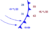 ①冷鋒:是冷氣團(tuán)向暖氣團(tuán)方向移動的鋒。暖氣團(tuán)被迫而上滑,鋒面坡度較大,冷暖兩方中,冷氣團(tuán)占主導(dǎo)的地位。