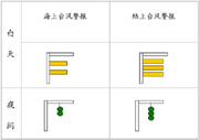(1)中國大陸:是我國有些省和地區(qū)臺風信號發(fā)布的規(guī)定。從中可一目了然,當本港及附近地區(qū)在48小時內將有臺風時,白天就掛起“┳”信號,夜間升起三盞白色信號燈;當本港及附近地區(qū)將有12級以上的臺風襲擊時,白天即掛起“╋”信號,夜間升起上下兩盞紅燈,中間夾一盞綠色燈的信號。船員和漁民們一看到它們,就知道這是強風襲擊最嚴重的信號。