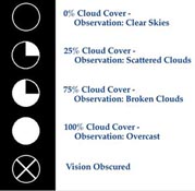 左圖為天氣圖上表示某個(gè)臺(tái)站各物理量的符號(hào),其中的用黃色加亮的圓圈符號(hào)表示該臺(tái)站的云量。右圖給出了各種云量的表示方法,其中空心圓表示云量為0%,晴天;圓圈被填充1/4,表示云量為25%;圓圈被填充3/4,表示云量為75%;圓圈被填滿,表示云量為100%;圓圈中有X,表示天空陰暗、模糊。