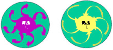 時針方向流轉(zhuǎn),在低氣壓區(qū)以逆時針方向流轉(zhuǎn)。如果是在地面,則按照氣壓與摩擦風(fēng)的關(guān)系,在高氣壓區(qū),風(fēng)一面以順時針方向流轉(zhuǎn),一面向周圍氣壓低的地方輻散開來,形成順時針外流的螺旋式氣流;而在低氣壓區(qū),風(fēng)一面以逆時針方向流轉(zhuǎn),一面向低壓中心區(qū)域匯流輻合進(jìn)去,形成逆時針內(nèi)流的螺旋式氣流。