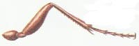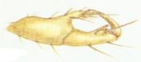 ⑧攀緣足:生活在毛發(fā)上的虱類,跗節(jié)只有1節(jié),最末一節(jié)為一大型鉤狀的爪,脛節(jié)肥大,外緣有一指狀的突起。當(dāng)爪向內(nèi)彎曲時(shí),尖端可與脛節(jié)端部的指狀突起密接,構(gòu)成鉗狀的構(gòu)造,牢牢地夾住寄主的毛發(fā)。這種足叫做攀緣足。