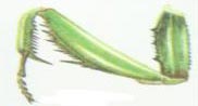 ③捕捉足:螳螂、獵蝽等捕食性昆蟲是一類益蟲,不吃莊稼,專門靠捕食小動(dòng)物生活,它們從卵里孵出來(lái)就有一對(duì)刀狀的前足。這種前足的基節(jié)延長(zhǎng),腿節(jié)腹面有槽,脛節(jié)可以折嵌到腿節(jié)的槽中,腿節(jié)和腸節(jié)上還常裝備著銳刺,是捕捉獵物的有力武器。當(dāng)它捕獲獵物時(shí),可以利用腿節(jié)和脛節(jié)把要吃的東西夾住,再利用脛節(jié)內(nèi)側(cè)和腿節(jié)外側(cè)銳利的刺將獵物撕碎吃掉,這種足叫捕捉足。