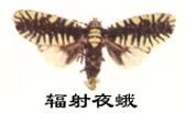 體長(zhǎng)20毫米左右;翅展49毫米左右。頭部及胸部藍(lán)黑色,下唇須第1節(jié)下緣及第2節(jié)前后端有粉黃斑,額上方有1粉黃條,頸板及胸背均有粉黃條,足有粉黃斑;腹部藍(lán)黑色,基部幾節(jié)背面有粉黃斑,臀毛簇粉黃色(雌蛾為藍(lán)黑色),腹部腹面粉黃色,側(cè)面有藍(lán)黑斑(雌蛾則為藍(lán)黑色,側(cè)面有粉黃斑);前翅底色粉黃,中部為藍(lán)黑色棒狀條,帶許多同色的輻射條,在前線有l(wèi)0條,外緣有6條,后緣有6條及1塊狀斑,棒狀條前緣有4個(gè)粉黃點(diǎn),后緣中部有1個(gè)粉黃點(diǎn),外半部有4條灰藍(lán)色波浪紋;后翅基半部褐黑色,前緣及外半部粉黃色,有3黑縱條。