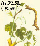尺蛾的幼蟲稱為"尺蠖",群眾叫"步曲蟲"或"弓腰蟲"。腹部只在第6節(jié)和末節(jié)上各有1對足,行動時身體一屈一伸,如同人用手量尺一樣。休息時用腹足固定,身體前面部分伸直,與所站的植物成一角度,擬態(tài)如植物的枝條。幼蟲受驚時會吐絲下垂,吊在半空中,稱為吊死鬼,常見的如國槐尺蠖。