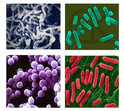 (左上)雙歧桿菌,(右上)乳酸桿菌,(左下)腸球菌,(右下)大腸桿菌